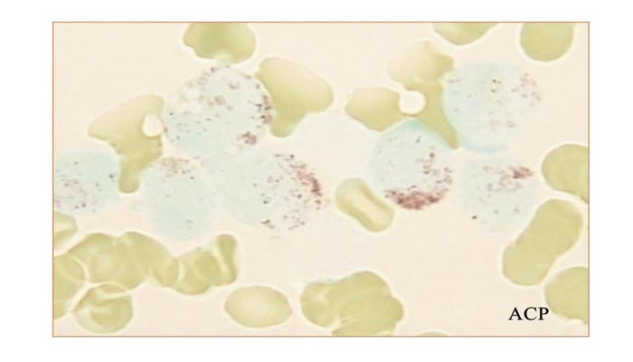 Acid Phosphatese stain is based on diazotization-coupling principle. At pH0.5, Acid Phosphatase hydrolyzes Naphthol AS-Bl Phosphoric Acid and releases Naphthol AS-B1 to mix with diazonium salt and form insolublecolored precipitate in cytoplasm.