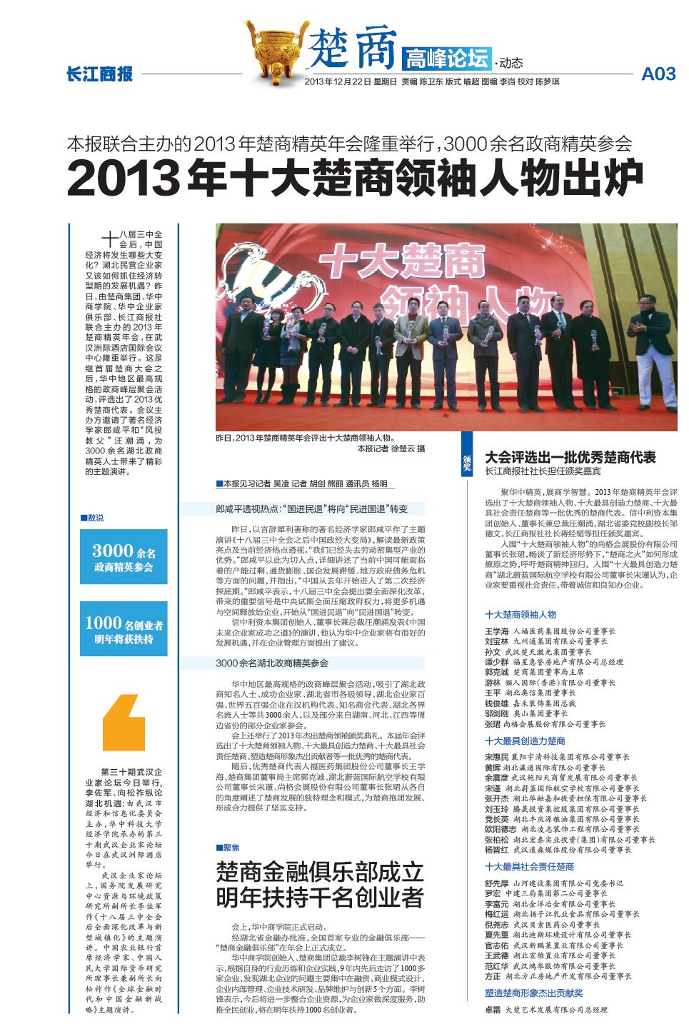聚華中精英,展商學(xué)智慧。長(zhǎng)江商報(bào)聯(lián)合主辦的2013年楚商精英年會(huì)評(píng)選出了十大楚商領(lǐng)袖人物、十大最具社會(huì)責(zé)任楚商等一批優(yōu)秀楚商代表。我公司董事長(zhǎng)倪堯志榮獲十大最具社會(huì)責(zé)任楚商。
