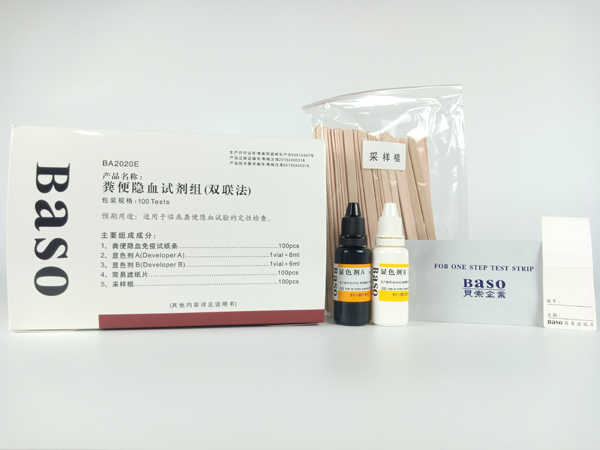 在本雙聯(lián)法試劑組中,BaSO獨有的化學(xué)法隱血試劑系利用特殊的Pyramidon配方當(dāng)作呈色指示劑,在酸及H2O2的作用下,與血紅蛋白作用,產(chǎn)生紫藍 紫紅的顏色(可據(jù)此進行半定量)。Pyramidon在藥劑學(xué)上早期常被用于鎮(zhèn)痛解熱口服劑,因此它的安全性無庸置疑。試劑組中的免疫法為糞便隱血免疫試紙條,其采用的是雙抗體夾心法試劑,試劑含有被事先固定于膜上測試線(T)的抗血紅蛋白抗體和對照線(C)的相應(yīng)抗體。本糞便隱血雙聯(lián)法試劑綜合了二種試劑檢測方法的優(yōu)點,可提高臨床對糞便隱血檢體的陽性檢出率,讓醫(yī)師取得較準(zhǔn)確的結(jié)果數(shù)據(jù)。尤其是利用BaSO化學(xué)法試劑能對糞便隱血進行半定量評判的特點,有利臨床對病人治療結(jié)果的追蹤和觀察、科學(xué)的指導(dǎo)用藥,故BaSO糞便隱血試劑組(雙聯(lián)法)是目前較先進的糞便隱血檢測試劑盒。